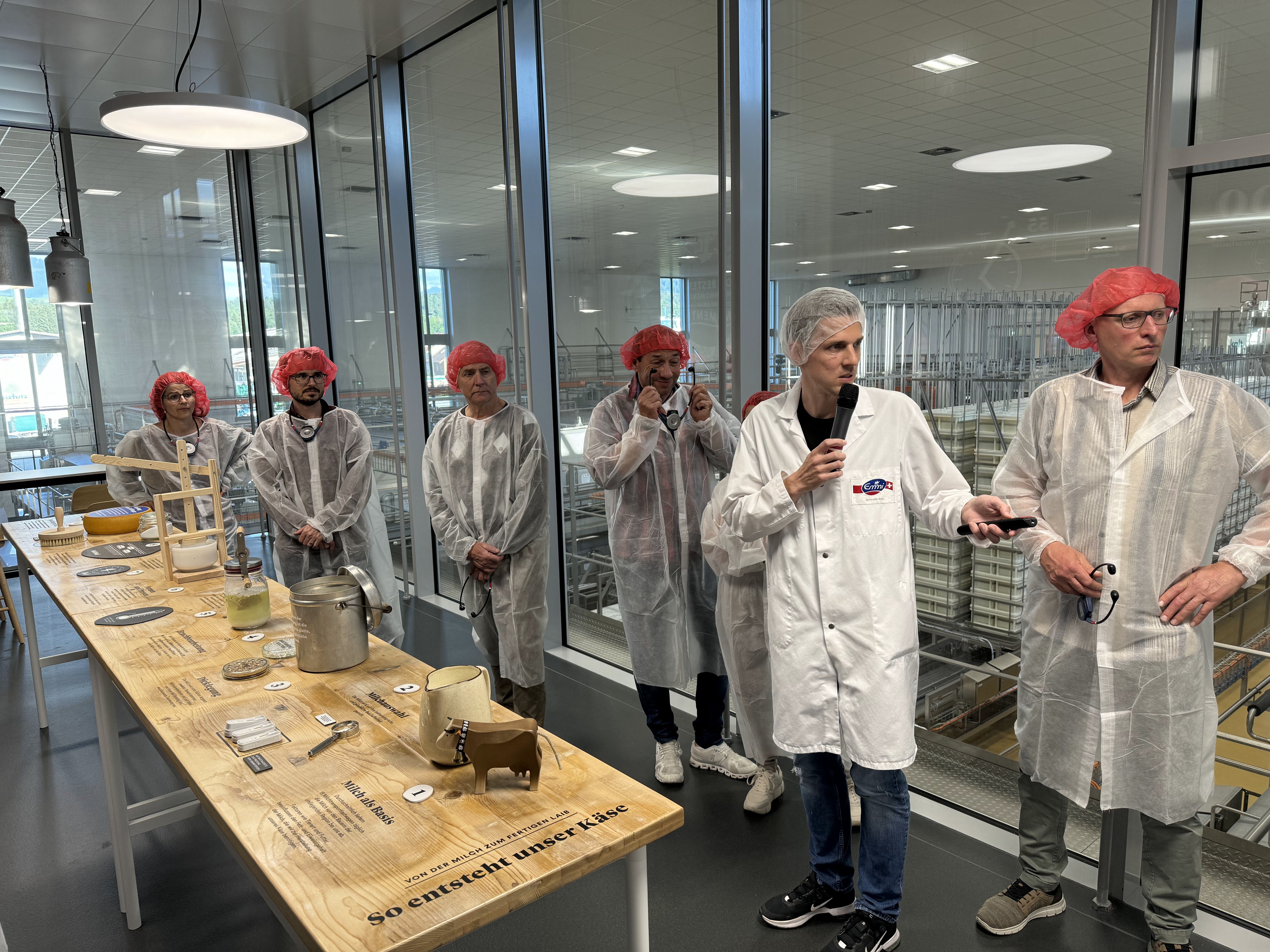 Pünktlich um 19:00 Uhr werden wir von Josef Wyss am Tor empfangen, in zwei Gruppen aufgeteilt und mit Kopfhörer, Schürze und Haube ausgerüstet durch die imposanten Produktionshallen geführt.